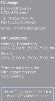 info@fs-design.com FS-Design, Frank Schleidt - Bahnhofsstraße 67-69 - 64569 Nauheim - Telefon: 06152/8040-0 - Fax: 06142/8040-20
